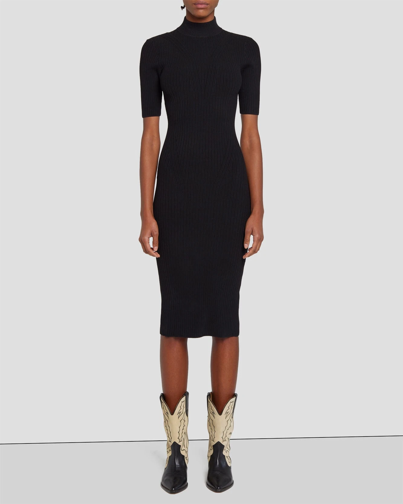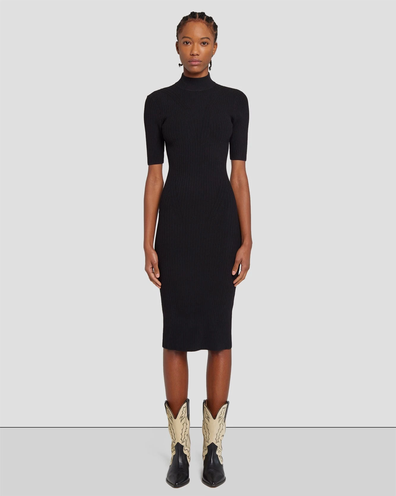 Business in the front, party in the back. Featuring 3/4 sleeves, and a mockneck, this bodycon dress has delicate ribbed detailing and stitchwork to add contour and dimension. Dramatic back cut-outs set this dress apart from the rest.