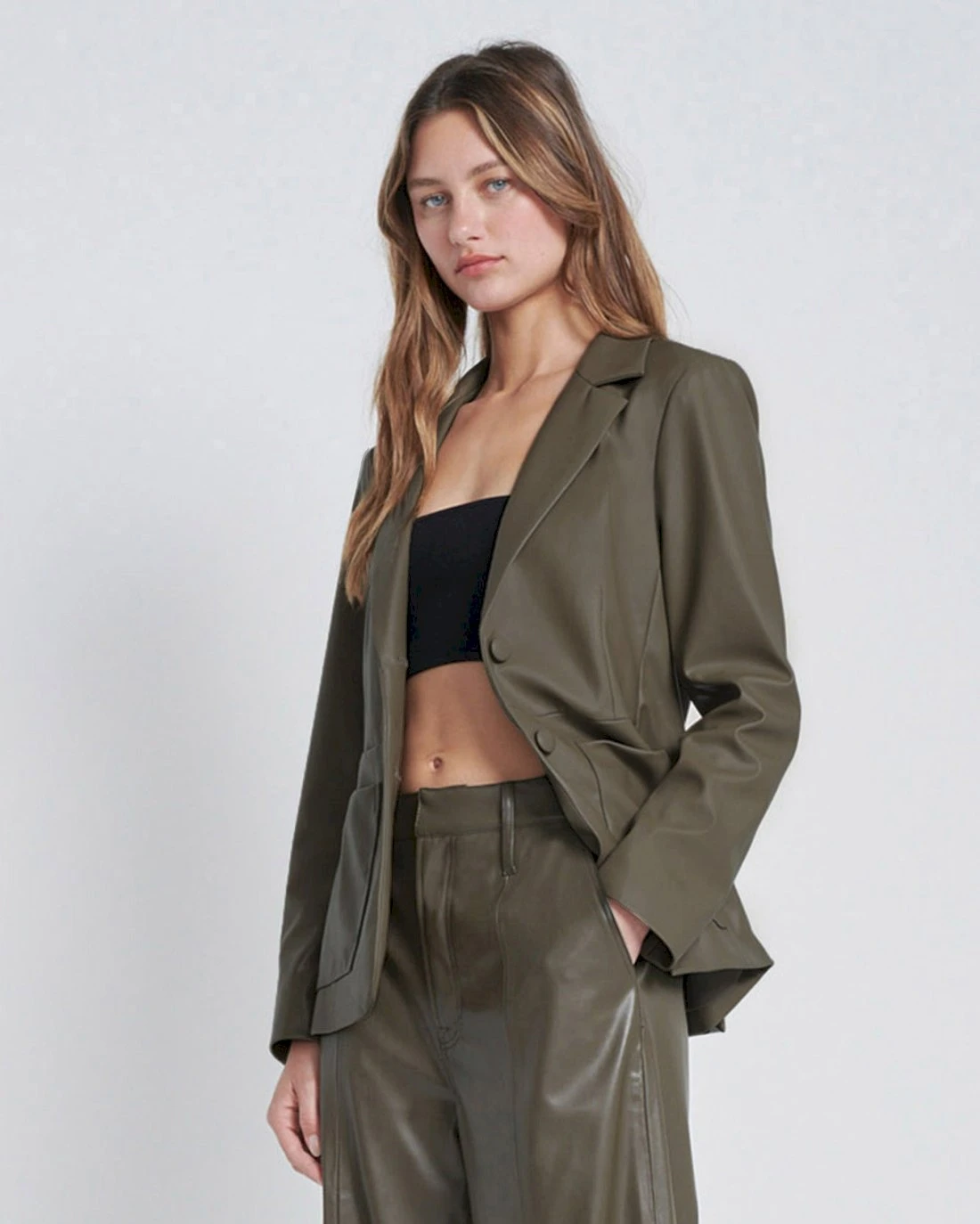 Tailor your outerwear in a season-perfect faux leather blazer with modern appeal. From covered buttons to oversized patch pockets and an optional waist-tie for added cinch, this innovative blazer is crafted with elegance in mind.
