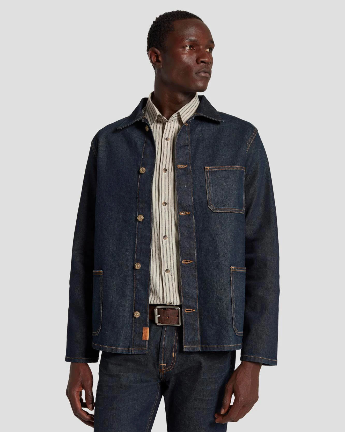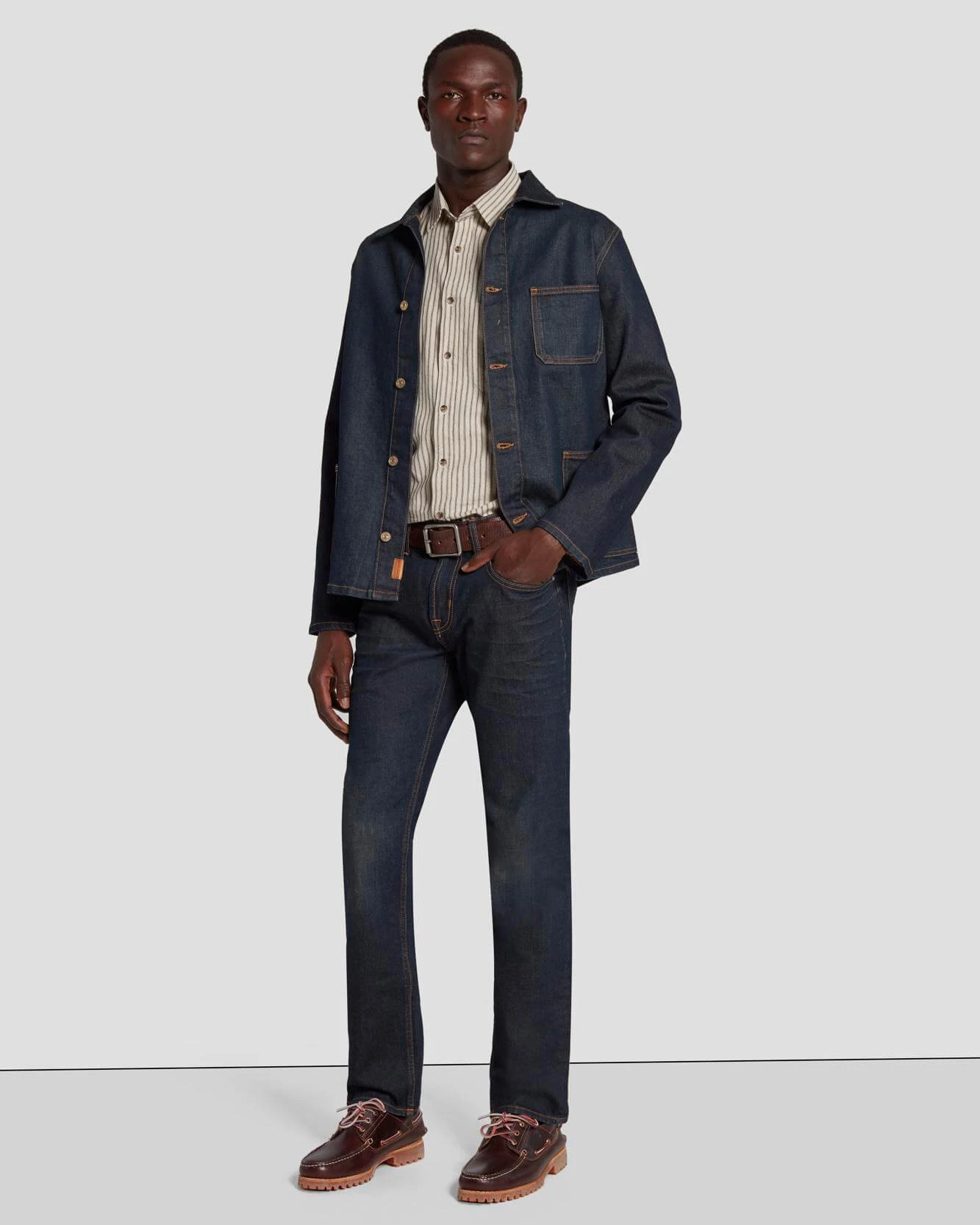 Cut from Japanese denim in an authentic blue rinse, this piece is accented with unique leather labelling for an elevated feel. This 3-pocket jacket looks great over a turtleneck, tee or button-down.