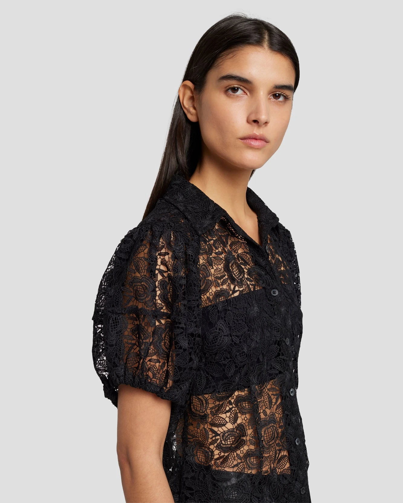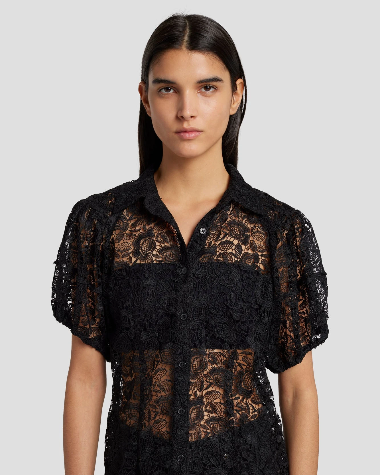 We love a little romance. This statement button-up blouse boasts sheer lace panels with floral detailing and romantic puff sleeves cinched in with elastic ruching. Wear it over a black bandeau or a nude tank top.