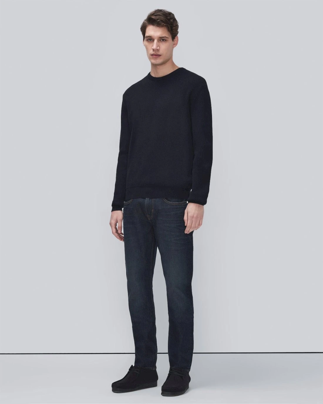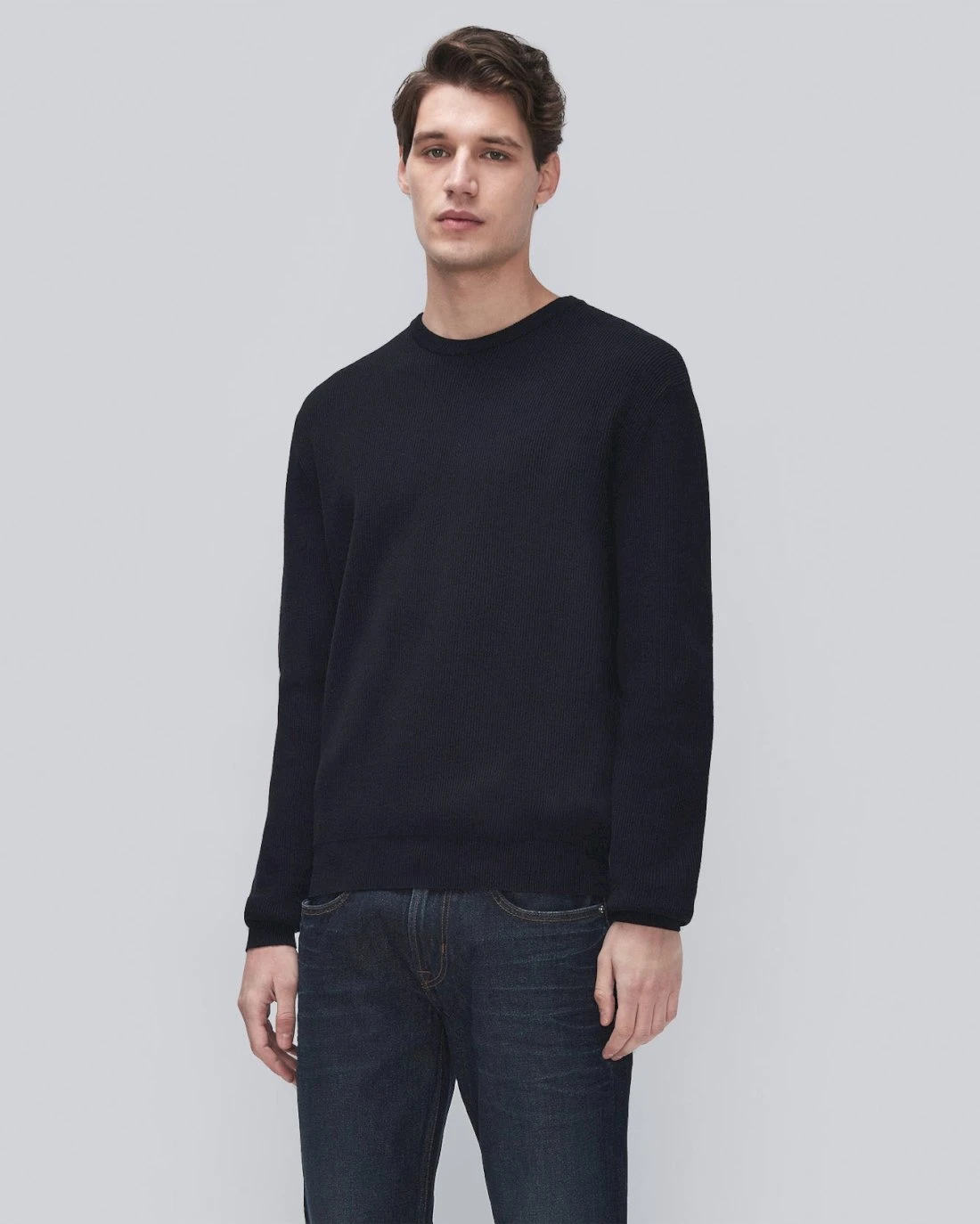 A must-have sweater is updated in Luxe Performance fabrication. Ribbed knit, rounded neck, banded cuffs and hem. Layer this men’s sweater over a tee or button down and style with jeans or chinos.