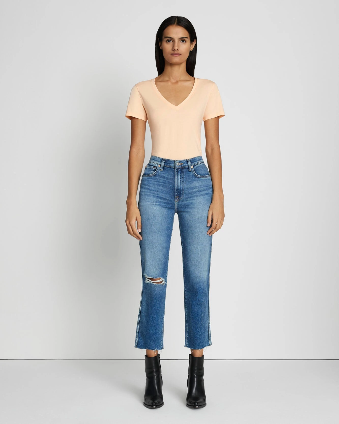 Our high waist cropped straight finds ultra-cool style with a medium indigo wash, well-placed distressing at the knee, and a raw hem. Crafted from our signature Luxe Vintage denim, which combines vintage style and the perfect amount of stretch. Pair with fitted knits or a crisp button-down for a chic look.