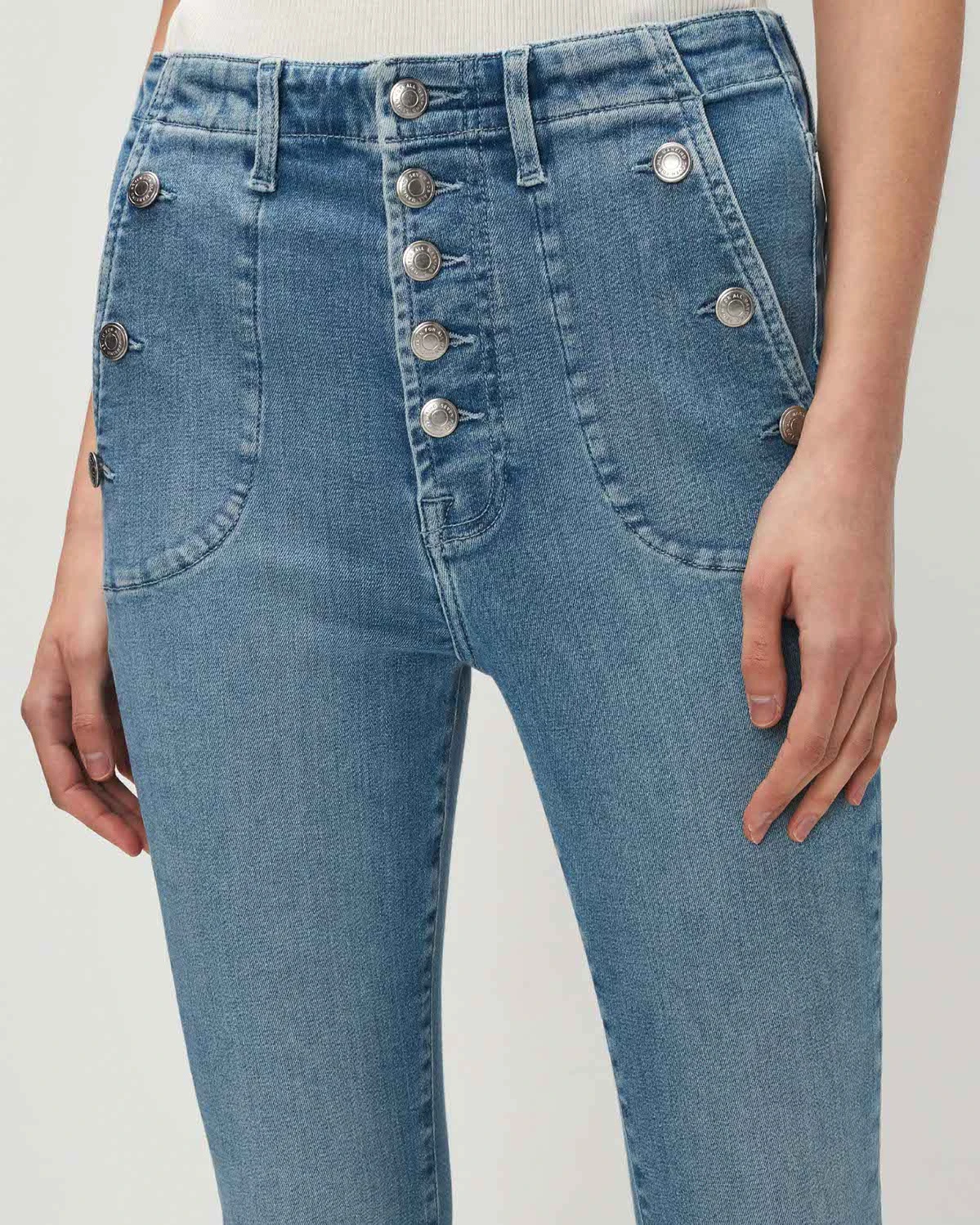 Our highest rise skinny jean sits way above the waist and is finished with a sleek, skinny leg. Crafted in our signature premium denim with stretch in a soft blue wash, punctuated by an exposed button fly and exposed button slant pockets. Pair with a fitted, tucked top to make the most of an elongated silhouette.