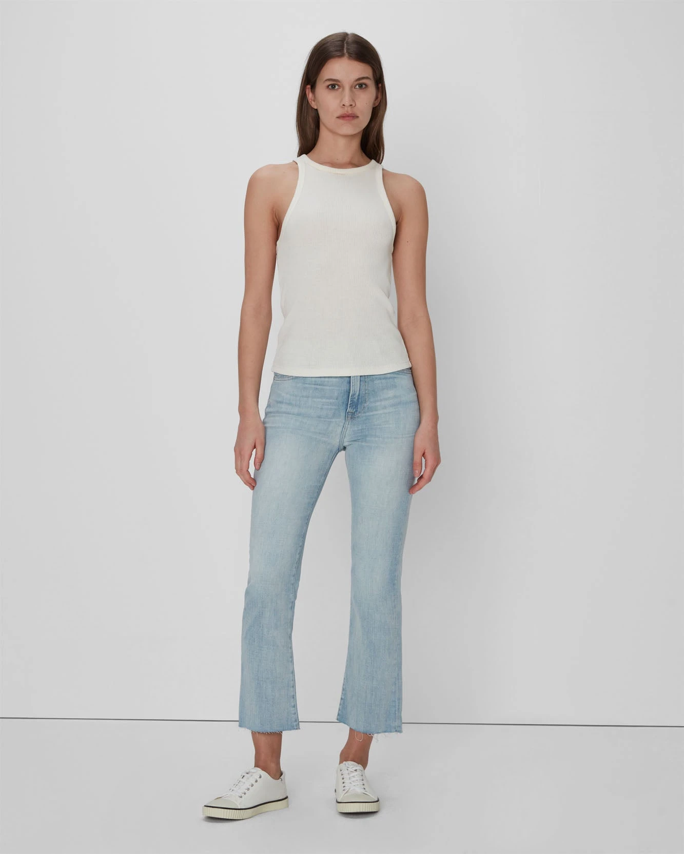 Offered in an ever-versatile neutral hue, our finely ribbed tank features a shoulder baring, racer back. This super soft essential is the perfect layering companion, or wear solo with your cutoff shorts for those days in the sun.