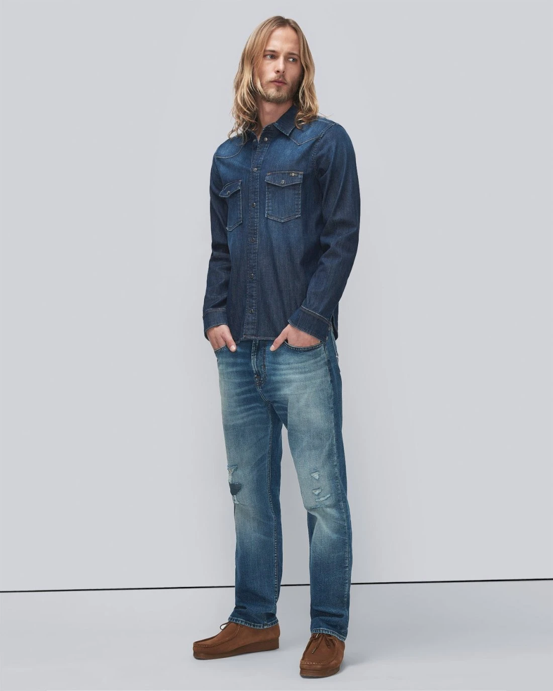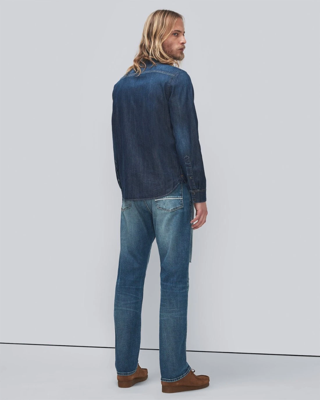 Our newest fit, Cooper J is a relaxed, straight fit with a higher rise and a slightly shorter inseam. This version is made modern with Selvedge seaming– an outseam that protects your denim from fraying while also offering a bold finish. Medium indigo wash, light fading and whiskering with the right amount of distress.