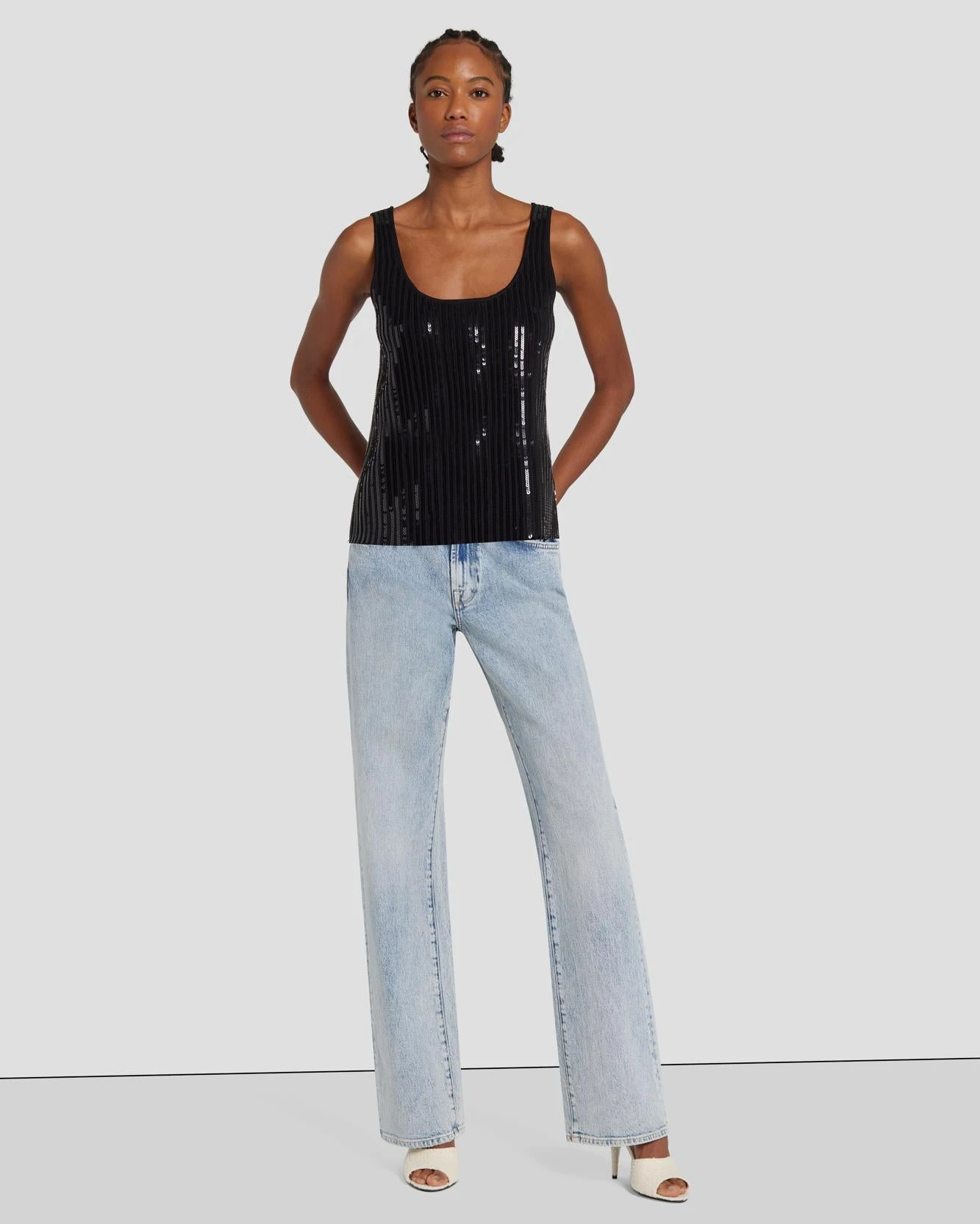 The sparkly tank you need. With vertical sequin stripes and a square neck, this black tank elevates the everyday. The perfect glam staple to amp up your style game.