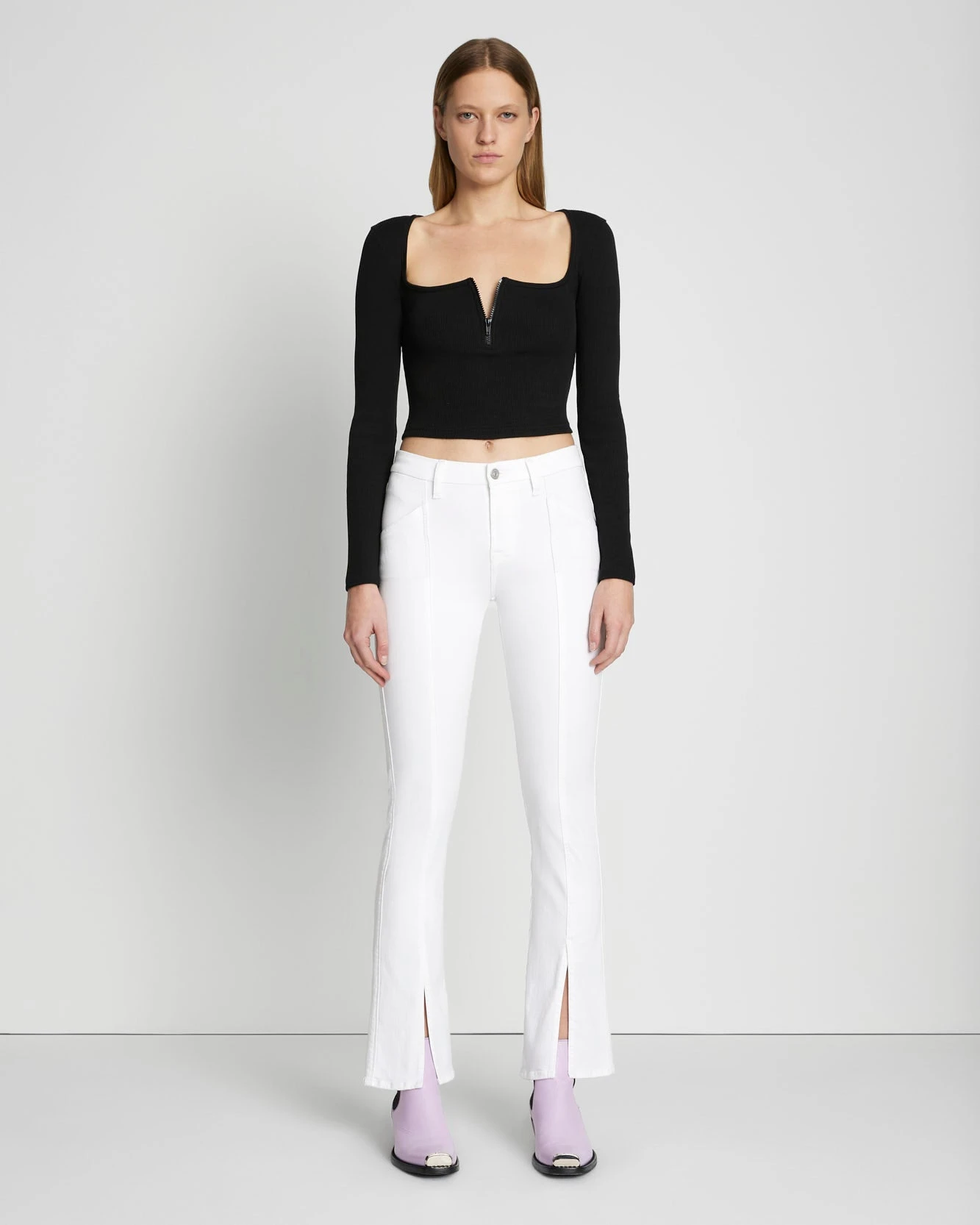 Fashion-forward front split hems and seaming add a seasonal update to our classic, mid-rise, straight-leg jeans. Crafted with our Slim Illusion denim that shapes and sculpts to create a refined shape, these are a pair of women’s denim that has a contoured waist that provides a snug fit and a versatile silhouette.