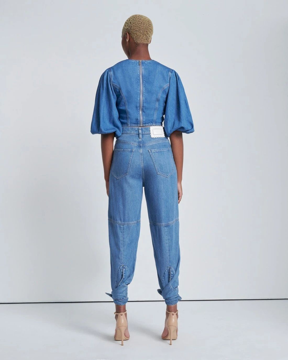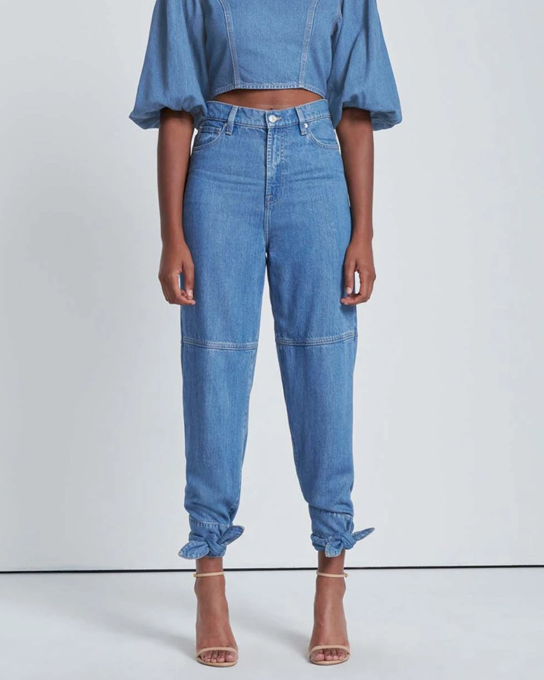 Our new Denim Lustre collection features feminine detailed pieces crafted from biodegradable and compostable fabrics that offer breathability, comfort, and a super soft hand feel. The Tapered Ankle Tie Jean stands out with a beautifully draped leg and bow accents that tie and taper the hem. Pair back to the Corset Top for effortlessly sophisticated denim-on-denim styling.