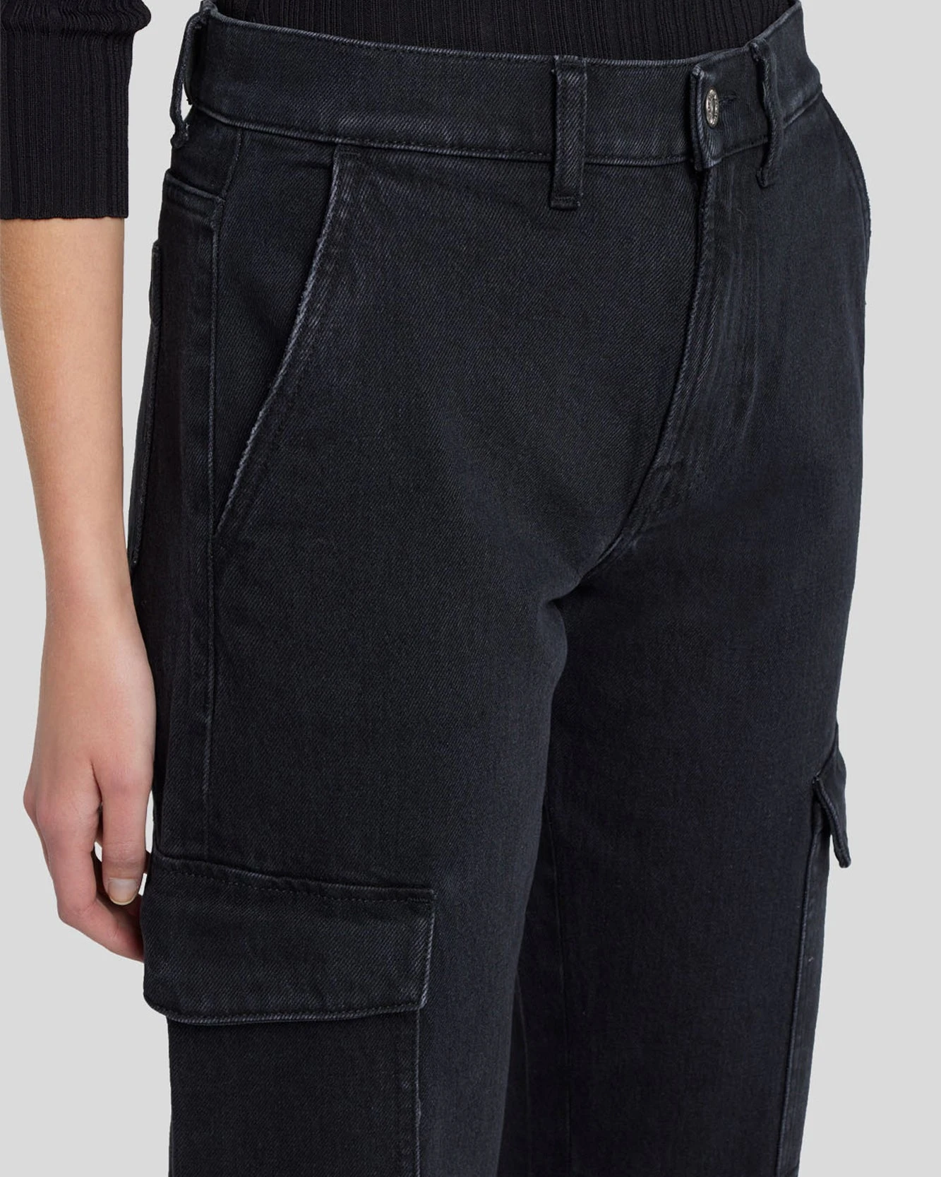 Stay on trend with these cropped mid-rise, denim cargo pants. With a slim, straight fit from hip to mid-calf, these cargo pants feature side patch pockets with flaps for added style. Pair with a slim tee or an oversized shirt for an off-duty look in denim pants designed with versatility in mind.