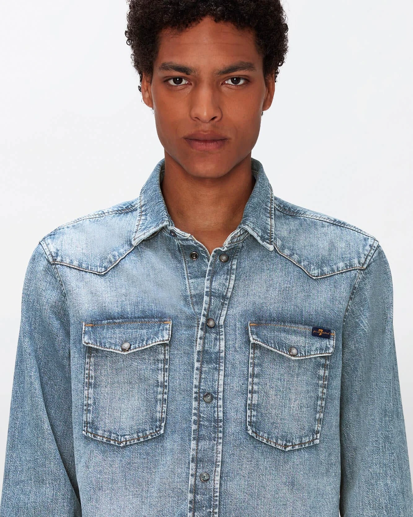 Our Men’s Western Shirt is a wardrobe must-have, thanks to its perfect fit, classic yoke, snap buttons and stitch detailing. The light wash gives it an authentic lived-in vibe. Wear it open over a white T-shirt, or buttoned up with denim or chinos.